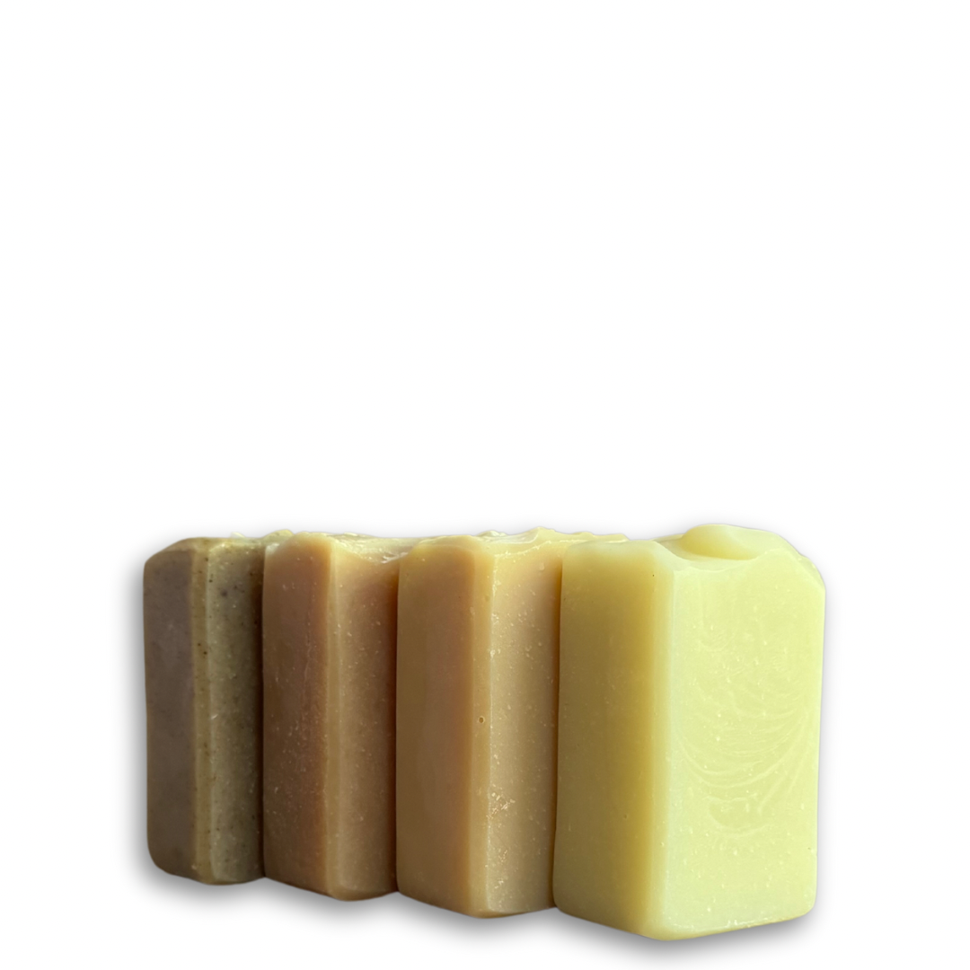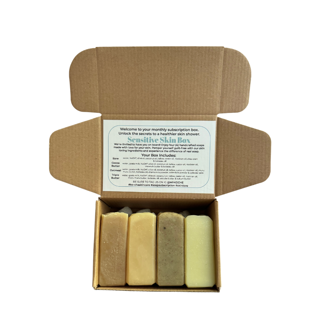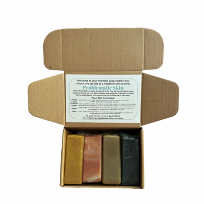 We offer three curated soap collections: Sensitive Skin, Scentsational, and Problematic Skin. Each box includes 4 handcrafted soaps specifically chosen for your skin type.